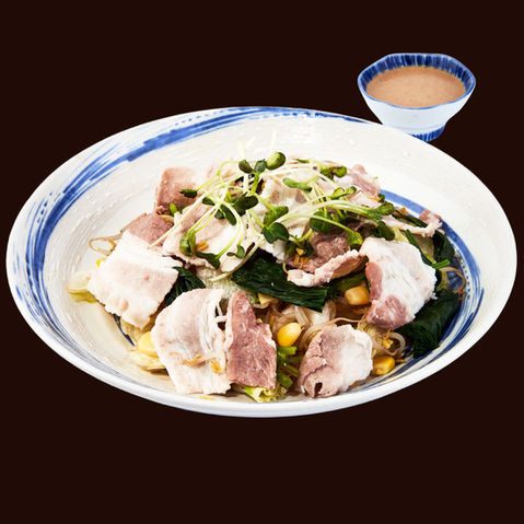 Cold noodles made from buckwheat flour and green tea and served with soy sauce-based dipping
