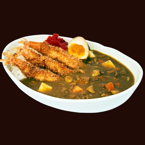 Japanese-style curry made with beef, carrots, and potato. Paired with rice and deep-fried breaded shrimp and topped with a soft-boiled egg