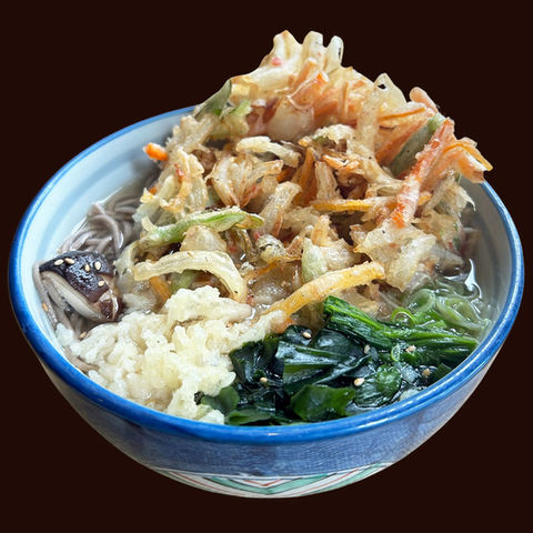 Cold noodles made from buckwheat flour and served with soy sauce-based dipping, comes with assorted tempura